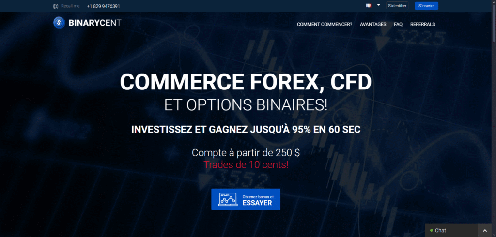 BinaryCent positions itself as a broker for forex, CFD, and binary options trading. They advertise returns up to 95% in 60-second trades and offer a 100% deposit bonus to new traders.